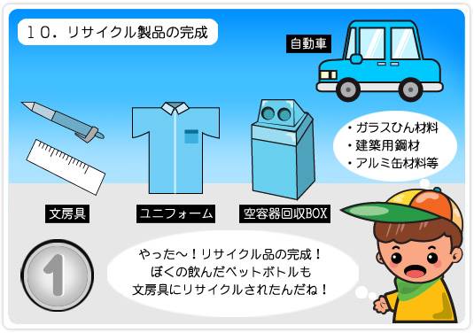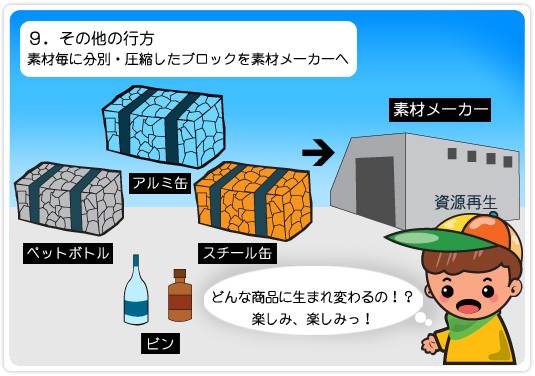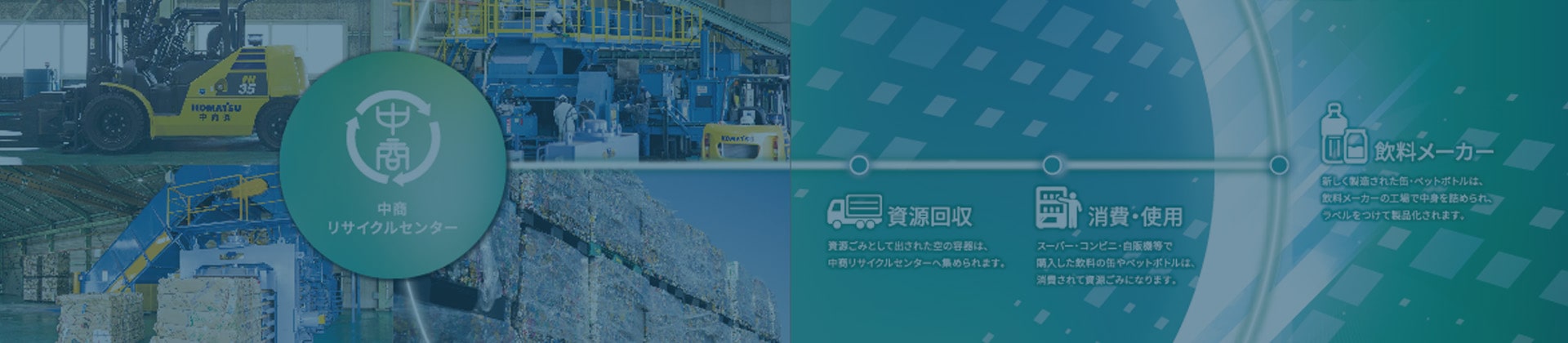 自動販売機構の「空容器回収BOX」や資源ごみとして集められた空容器を中商リサイクルセンターへ回収し、分別・圧縮します。素材ブロックへ加工し、メーカー等へ原料として出荷。原料は工場やメーカーで数多くの工程を経て、様々なリサイクル製品へ生まれ変わります。