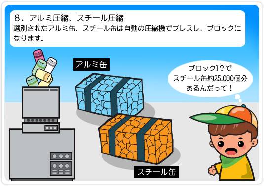 選別されたスチール缶は、プレス機で圧縮されブロック素材に加工されます。