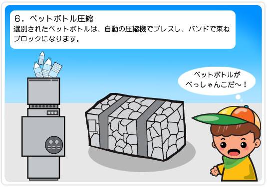 ペットボトルは自動圧縮機でプレスし、バンドで束ねてブロック素材に加工されます。