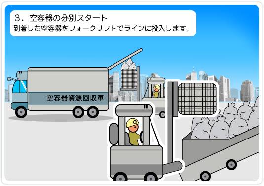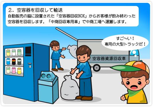 自動販売機横「空容器回収BOX」や資源ごみとして集められた空容器を中商リサイクルセンターへ回収します。空容器はフォークリフトによって運搬・投入されます。